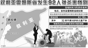 据新华社北京5月27日电 综合新华社驻外记者报道:据叙利亚媒体26日报道,25日夜间,叙利亚中部霍姆斯省胡拉镇发生92人被杀害的惨剧。国际社会对此表示震惊并强烈谴责这一袭击事件,要求追究肇事者责任。