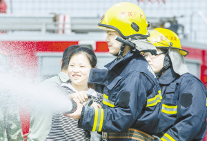 5月29日,周焰茹同学(左一)在体验灭火水枪的威力。 当日,重庆市北碚田家炳中学的13名留守儿童来到北碚公安消防支队,学习消防救援知识,感受消防员的生活。( 新华社发)
