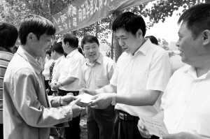 5月30日,西华县艾岗乡半截楼村近百名村民领到了免费的“爱心油”。据了解,免费送村民汽油、柴油活动是在省委宣传部驻村工作队协调下进行的,中国石化河南石油分公司已连续两年为贫困农民免费提供农机用油 ,此次免费提供11000升。图为该村村民领取油票。