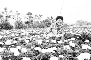 在商水县城关乡大井村万亩花卉种植基地内,花农陈喜莲面对待售的数万盆万寿菊满脸喜悦,今年她家2亩地花卉预计收入5万元以上。(张慧敏 摄)