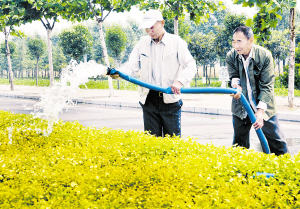 昨日,在周口大道北段,市园林处工作人员在为树木浇水。根据土壤、天气状况,市园林处适时调整,加强对树木的维护,确保树木健康成长。