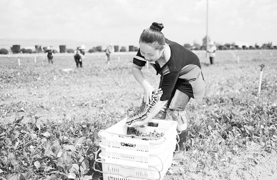 近年来,江西安义县通过创办大型生态农业科技园打造节水喷灌农业,发展菜心、芥兰等20多个品种有机绿色蔬菜种植,目前已形成核心区3048亩,辐射区5000亩,日产蔬菜20吨以上的蔬菜基地,产品销往欧盟、美国、澳大利亚、东南亚以及香港等国家和地区,带动周边500多农户致富,人均增收600多元。图为安义县黄洲镇玉菜业基地菜农在收获蔬菜。 新华社记者 周科 摄