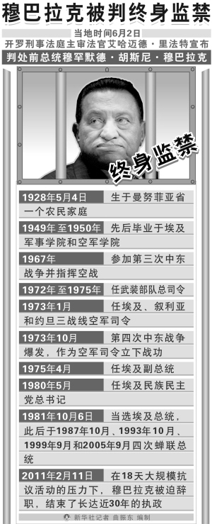埃及开罗刑事法庭2日就前总统穆巴拉克等人涉嫌谋杀示威者和腐败的案件作出一审宣判,判处穆巴拉克和前内政部长阿德利终身监禁,穆巴拉克两个儿子和6名前高级警官无罪。