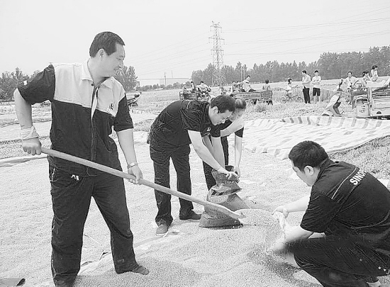 6月4日,中石化淮阳分公司把服务三夏当作目前的工作重点,通过成立送油小分队和青年志愿者爱心帮扶队,帮助军烈属、贫困户收晒小麦。图为帮扶小分队在淮阳县王店乡佐桥行政村助收的情景。 (记者 李寒 通讯员 闫海云 摄)
