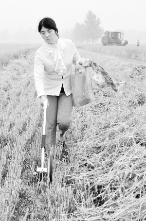 河南麦收进入高峰 6月5日,在河南南阳市宛城区汉冢乡柳树营村,农机手邢永征的妻子在丈量即将收割的麦地面积。记者从河南省农机局获悉,截至6月4日17时,全省已收获小麦面积2929万亩,其中机收面积2849万亩,机收率97.3%,日投入联合收割机8.7万台,日收获小麦656万亩,进入收割高峰期。新华社记者 李博 摄