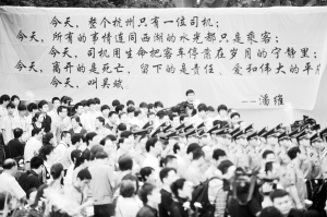 杭州举行“最美司机”吴斌追悼会 6月5日,追悼会场外挂起诗人潘维为吴斌写的诗。当日上午,“最美司机”吴斌追悼会在杭州市殡仪馆举行,来自社会各界的数千名群众与这位平民英雄进行最后的告别。 新华社记者 黄宗治 摄