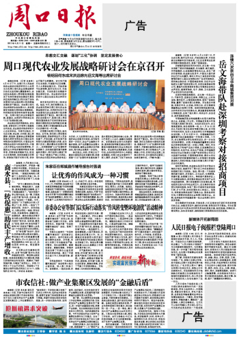 徐光指出,当前,河南正处于建设中原经济区的关键时期,持续探索“三化”协调科学发展的路子是中原经济区建设的核心任务。周口已经进入工业化、城镇化加速推进,全面建设农业现代化的新阶段,国务院《指导意见》提出把周口建设为国家级现代农业示范区的要求。农业部对此高度重视,迅速行动,由农村经济研究中心专家组成课题组,对周口农业发展进行了深入调研,并起草了《关于加快发展现代农业推动周口经济跨越发展的若干意见》。周口作为河南的缩影,我们主动服务中原经济区建设,探索走好“三化”协调科学发展的路子,不断强化新型农业现代化的基础作用,努力在粮食生产上发挥核心作用、在现代农业发展上发挥示范作用、在中原经济区建设上发挥支撑作用。(下转A4版)