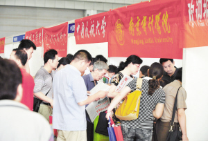6月10日,考生和家长在高校招生咨询台前咨询,了解招生信息。当日是江苏高考结束次日,江苏省在南京国际展览中心举行2012年普通高校招生咨询会,各地129所本一、本二、本三、高职专科等院校向考生和家长提供招生咨询。(孙参 摄)