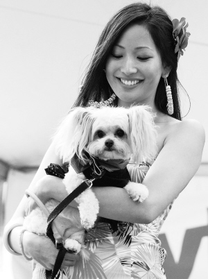 6月9日,在加拿大多伦多,一只盛装的宠物犬被模特抱在怀中进行时装展示。