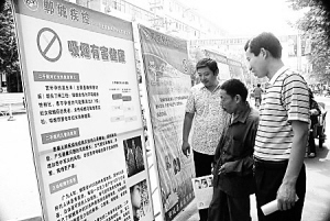 5月31日是第25个世界无烟日,郸城县疾控中心围绕“小小一支烟、危害万万千”的主题,制作戒烟知识宣传版面,设立咨询台,散发戒烟知识宣传单,让群众进一步了解吸烟有害健康的知识。图为过往群众在观看吸烟有害健康知识宣传版面。(记者 卢好亮 通讯员 柴元红 摄)