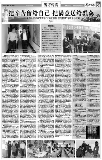 户政管理小天地,服务民生大舞台。市公安局副局长程俊华表示,户籍、身份证的办理虽然是公安机关的内部业务之一,但它却直接牵涉着广大人民群众的切身利益,全市公安机关户政管理部门将以这次“强化服务、规范管理 ”专项活动为契机,持续强化户籍民警的综合素质,不断提高服务管理水平,进一步提高全市公安户籍管理服务质量和工作效率,努力提升和展示公安户政窗口的良好形象,更好地为群众提供优质、高效、便捷、周到的服务。同时,真诚欢迎社会各界及全市广大人民群众对户籍窗口公安民警的管理和服务质量进行监督,对户籍民警的违规、违纪行为,市公安局将依照有关规定予以严肃处理,决不姑息迁就。