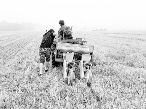 夏种一日早,十日赶不到。麦子一收割,农民就抓紧时间抢种秋作物,为秋粮的丰收打下好基础。图为6月10日太康县朱口乡查庄村农民在麦收后的田地里机播玉米。(记者 程鹏 摄)