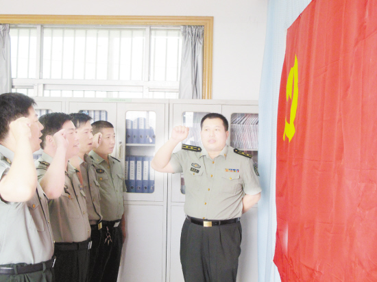 临近“七一”,西华县人武部组织全体党员面对鲜红的党旗,重温入党誓词,进一步强化党员先锋模范、创先争优意识,激励引导党员立足岗位多奉献,以实际行动为党旗增光添彩。图为党员面对党旗重温入党誓词。(李自强 摄)