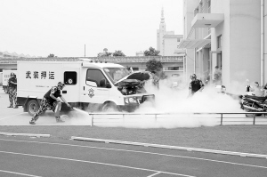 6月27日上午9时,在周口市公安局宽阔的训练场上,葱绿的草坪更显生机。“争做社会治安的巡逻队,抢险救灾的突击队”、“筑牢社会责任,服务平安周口”等巨幅标语在充气气球的载送下迎风飘扬,会场主席台上方,“周口市保安服务公司2011式服装换装仪式暨业务技能汇报表演”的横幅格外醒目。远处,场地两侧有序地摆放着若干军事训练器械,仪容严整的保安队员们肃立在训练场一旁。这里,一场气势恢宏的业务技能练兵汇报演出即将启幕。