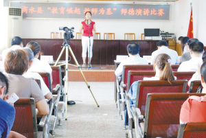为培养广大教师学为人师、行为世范的师德风范和职业素养,进一步转变工作作风优化教育发展环境,不断提升教育教学水平,日前,商水县教体局在全县教育系统开展了“教育崛起,教师为基”师德主题教育活动。图为该县师德演讲比赛活动现场。(戚二中 摄)