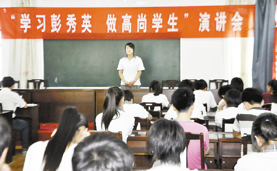 自市委号召开展“向彭秀英同志学习”活动以来,淮阳中学积极开展各种学习活动。近日,该校学生在校团委统一安排下,经高一、高二团支部初选,推荐82名学生参加了“学习彭秀英,做高尚学生”演讲会。此次演讲比赛,不仅锻炼了学生的演讲能力,又陶冶了学生的情操,使全体在场学生经受了一次高尚的道德情感教育。(李涛 摄)