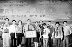 本报讯(记者 杜少华 通讯员 冯宇 王莉文/图)7月1日晚,市人民检察院在周口五一广场举办了一台隆重的“检察放歌庆七一”文艺晚会。全体检察干警与人民群众欢聚一堂,载歌载舞,为党的91岁生日献礼。鹿邑县人民检察院选送的话剧小品《检察官的风采》节目荣获一等奖。