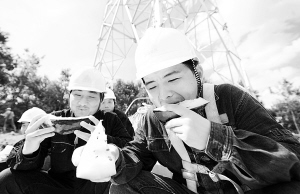 7月4日,在安徽省池州市里山乡的220千伏枫观线工地,安徽送变电工程公司的施工人员在铁塔下吃西瓜解暑。新华社发