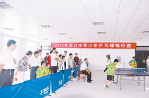 近日,2012年周口市青少年乒乓球锦标赛在扶沟县聋哑学校开幕。此次锦标赛旨是通过比赛发现和选拔一批优秀的乒乓球后备人才,为周口市参加河南省第十二届运动会提供乒乓球项目的人才保障。据了解,该比赛共有来自全市的9支代表队参加,运动员140多人,教练员20人,裁判员20人,比赛历时3天。图为比赛现场。(丁燕 摄)