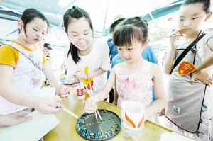 7月5日,一位社区里的小朋友(右二)在参加俱乐部组织的游戏活动。