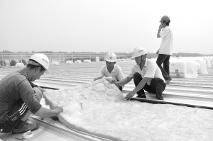 在河南久通电缆公司厂房主钢结构顶部,工人们正在铺设隔热棉和顶棚钢板。 该项目总投资30000万元,已完成投资5500万元。
