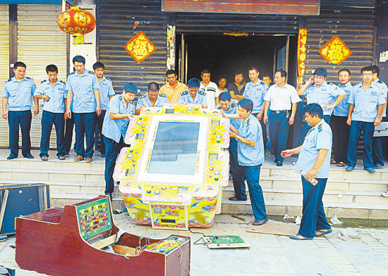 为更好地解决暑假期间网吧超时经营和违规接纳未成年人现象,7月15日,项城市开展了网吧治理专项行动。在专项行动中,对存在违规行为的网吧进行了取缔,对网吧中存在的赌博工具一律公开销毁。 (赵献伟 田垒 摄)