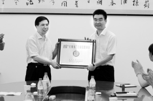 当日上午,市总工会副主席张廷河、周口供电公司工会主席李巍等领导一行莅临鹿邑县电业局检查安全生产工作并为该局授牌。图为市总工会副主席张廷河将奖牌授予鹿邑县电业局长徐其山。