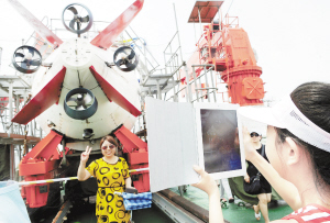 7月19日,游客在“蛟龙”号前拍照留念。连日来,“蛟龙”号母船“向阳红09”在青岛奥帆中心向公众开放,每天都吸引了数以千计的市民和游客登船参观。(新华社发)