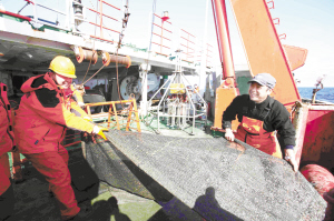 7月19日,科考队员将拖网从海底拉上“雪龙”号船甲板。7月19日,中国第五次北极科学考察队乘坐“雪龙”号极地科考船抵达北极圈内楚科奇海域,并进行海洋调查。 (新华社发)
