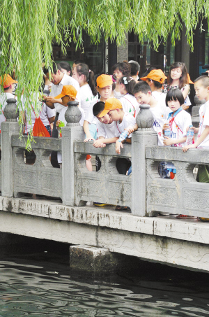 7月19日,40余名参加“青春助力行动——农民工子女看城市夏令营”活动的农村留守儿童免费畅游了趵突泉等济南名泉。该活动由共青团山东省委主办,让农民工子女走进城市、感受城市,丰富他们的暑期文化生活。(新华社发)