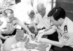 拥军优属是我们党和政府的优良传统,在第85个“八一”建军节来临之际,金海路派出所交管巡防大队民警带着米、面、水果等慰问品到市区西郊彭庄新村慰问抗美援朝老战士彭俊恒(中),给他送去组织的关怀和温暖。图为派出所民警正在详细询问彭俊恒的生活起居和身体状况。(记者 王亚辉 摄)
