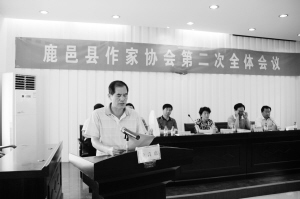 图为新当选的鹿邑县作协主席侯钦民在鹿邑县作家协会第二次代表大会上致辞。