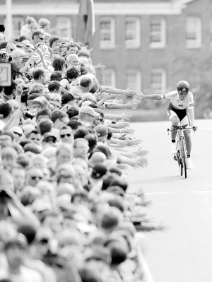 自行车——掌声送给参赛者 8月1日,葡萄牙选手奥利维拉完成比赛后,接受观众的掌声,他获得第18名。当日,伦敦奥运会公路自行车男子个人计时赛举行,每一位参赛者都获得了赛道两侧观众的热烈掌声。