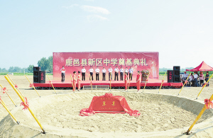 据了解,该项目占地266亩,设计建设标准教学班120个,总建筑面积12.866万平方米,教学楼、实验楼、图书楼、宿舍楼、食堂、运动场等设施齐全,建成后按标准可容纳7200名学生学习、生活,是一所高起点、高标准、现代化的全寄宿制学校。图为鹿邑县行政新区中学奠基仪式。 (冯伟 摄)