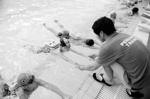 8月7日,游泳教练在为孩子纠正游泳动作。暑假期间,武汉各大游泳馆的儿童游泳学习班异常火爆,既能健身又能消暑的游泳,受到身处“火炉”武汉的孩子们的喜爱。