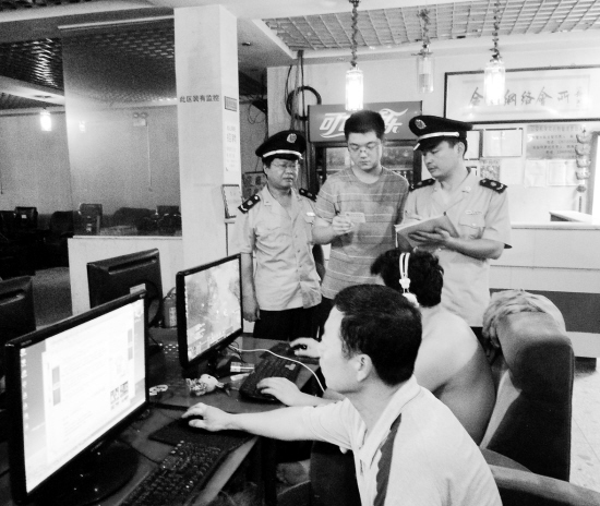 连日来,西华县工商局开展暑期网吧“文明上网”劝导行动,面对面劝导市民文明上网,杜绝不文明的上网行为。期间,工商人员查看了网吧的经营证照,核查了上网人员身份证登记情况,对个别网民在网吧抽烟、光背等不文明行为进行了劝阻。图为工商人员在一家网吧劝导市民文明上网的情形。 记者 张猛 摄