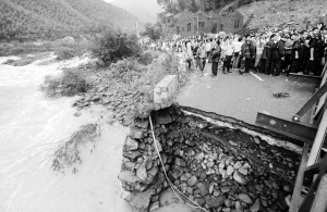 强台风“海葵”来袭致使安吉县降雨不断。8月8日,安吉县报福镇石岭村等地多处道路受损严重,连接石岭村与报福镇的一座长约30米的大桥被冲毁,导致在浙北峡谷农家乐游玩的游客与当地村民共700多人被困。 新华社发