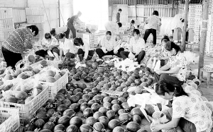 广西岑溪市农民种植一种名为“金红铃”的“迷你”小西瓜,一棵瓜藤只结一果,一年可种三次。这种小西瓜因个小瓜甜而深受消费者青睐。目前,岑溪市农民种植的500多亩“迷你”西瓜,在生长期时就全部被粤港澳等地的超市预订,供不应求。图为岑溪市马路镇的农民们将贴好标签的西瓜装箱外运(8月10日摄)。新华社记者 张爱林 摄