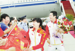 中国奥运代表团回国 8月14日,中国跳水队领队周继红(中)和中国乒乓球队女队主教练施之皓(右一)受到人们热烈欢迎。新华社记者 金良快 摄