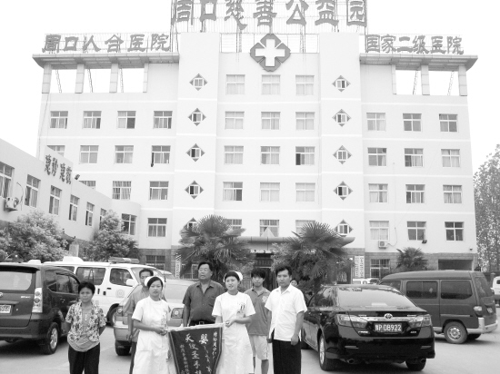 近日,商水县郝岗乡南社村村民刘某的妻子在周口人合医院顺利生下3子。该院考虑到其家庭困难,免除其部分费用,并为其捐款1000元。图为患者家属给医院赠送锦旗,以表谢意。 记者 史书杰 摄