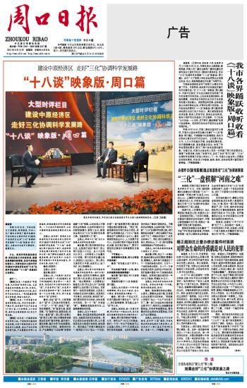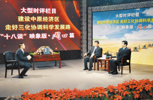 昨晚10时05分,河南电视台卫星频道、新闻频道,河南人民广播电台新闻广播并机播出河南电视台大型时评栏目《建设中原经济区走好“三化”协调科学发展路“十八谈”映象版·周口篇》。本报全文刊发节目解说词,敬请关注。