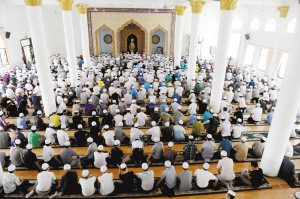 8月19日,穆斯林群众在郑州清真大寺参加开斋节典礼。当日是穆斯林民众的传统节日开斋节,数千名穆斯林群众在河南省郑州市清真大寺举行典礼,喜迎节日。(新华社发)
