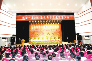 近日,郸城一高隆重召开2012届优秀毕业生欢送大会,市政府副秘书长丁建清、市教育局局长张学成和郸城县县长刘广明等四大班子领导出席了大会。会上,郸城一高共向考入清华大学、北京大学及复旦大学、中国人民大学、中国科技大学的31名优秀毕业生颁发奖金26.4万元。图为会场全景。(王雪涛 摄)