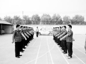 为加强干线公路流动治超工作,打击非法超限运输行为,近日,淮阳县根据市政府文件精神,依法组建了流动治超中队,并对新组建的治超队员加强岗前培训,努力建设一支形象好、素质高、作风硬、纪律严的流动治超执法队伍。图为淮阳县公路局流动治超中队在进行军训。(侯俊豫 李茹 摄)