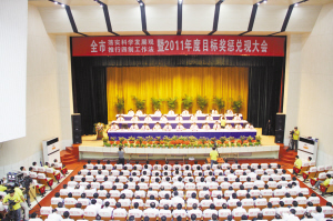 项城市委常委、组织部长郭峰宣读了《项城市考核工作委员会关于2011年度科级领导班子和科级干部落实科学发展观考核评价结果的通报》和《项城市委、市政府关于表彰2011年度落实科学发展观优秀科级领导班子和优秀科级干部的决定》。
