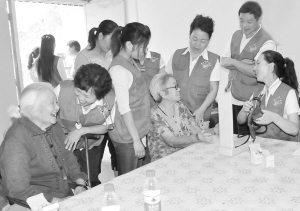 9月8日,市中心医院志愿者服务队来到川汇区永青老年护理院,为老人测量血压、检测血糖,并开展有针对性的健康咨询活动,受到老人们的热烈欢迎。记者 王映 摄