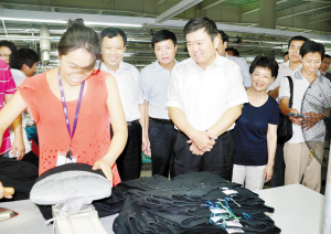 郸城鼎祥制衣有限公司是郸城县2010年引进的台资企业,总投资2000万美元,年产服装1300万件,产品远销美国、加拿大、英国等10多个国家。为破解企业用工难题、方便群众就近就业,鼎祥公司创新生产、用工模式,在郸城县乡镇建成了10个乡村车间,把企业建到了农民家门口。走进鼎祥公司汲冢镇谢寨服装加工车间,看到车间内生产井然有序、一派繁忙景象,徐光十分高兴,不时与企业员工亲切交谈,关心他们的工作生活情况。“过去在外边打过工没有?在外打工与在家打工有什么不同,收入怎么样?”徐光亲切询问。“以前在外边打工,现在有了孩子,为照顾孩子和老人,就没有出去打工了。在家打工可以照顾孩子和老人,收入还可以,按计件算,多劳多得。”听到员工李海英满意的回答,徐光脸上露出了喜悦的笑容。他指出,省委书记卢展工对鼎祥公司的发展十分关心,市委、市政府也高度关注。从目前企业的发展形势来看,这种创新的用工、生产模式,受到了用工企业和员工的一致欢迎,希望各级各部门认真总结“鼎祥经验”,在进一步完善提高的基础上,在全市范围陆续展开。