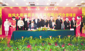 本报讯 (记者 吴继峰 张猛) 9月11日上午,美国OSI集团与河南大用集团合资建设西华大用福喜农牧发展有限公司项目签约仪式在我市举行。省委常委、统战部长史济春,市委书记徐光,市长岳文海,副市长杨廷俊,交通银行河南省分行副行长单增建,以及美国OSI集团全球主席兼首席执行官谢尔登·拉文、美国OSI集团全球执行副总裁兼首席财务官魏孟贤、美国OSI集团全球副主席史帝文·拉文、麦当劳(中国)有限公司副总裁栾江红等出席签约仪式。