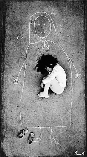 冷冰冰的地板上,画着一个戴着头巾,面带微笑的母亲,寥寥几笔,勾勒出一个妈妈的样子,一个小女孩脱掉鞋子,爬到画上面,头枕在妈妈胸前,蜷缩着,在她怀抱中沉沉睡去。昨天这张图片赚取了不少网友的眼泪。