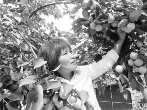 商水县平店乡妇女李东真正在采摘日本甜柿。近年来,该县各级党委和政府及所属农业、林业、科技、计生协等部门积极引导农民种植优质高效杂果,很多农户因此走上致富路。